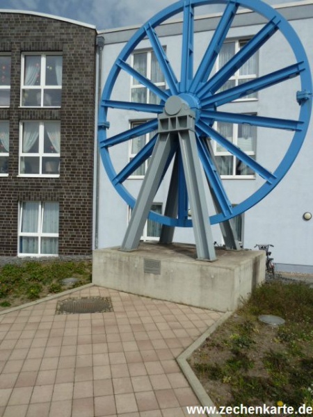 Position von Caroline Schacht 3 in Holzwickede in 2014. Die Seilscheibe stammt von der Zeche Fürst Leopold in Dorsten, vermutlich vom Schacht 1. Vielen Dank an Bernd Strehl.