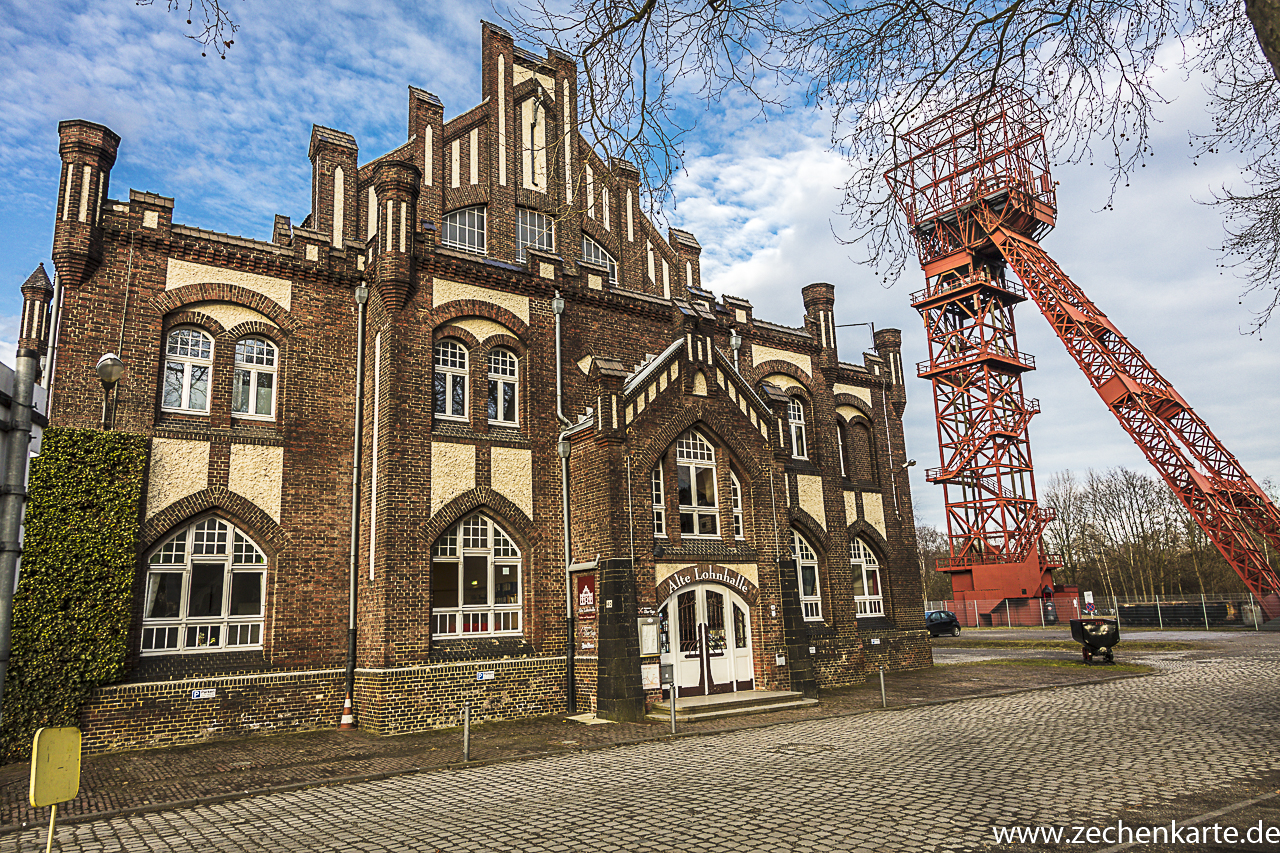 Fördergerüst von Bonifacius Schacht 1 und Lohnhalle der Zeche in Essen in 2017. Bild von Rüdiger Schnick.
