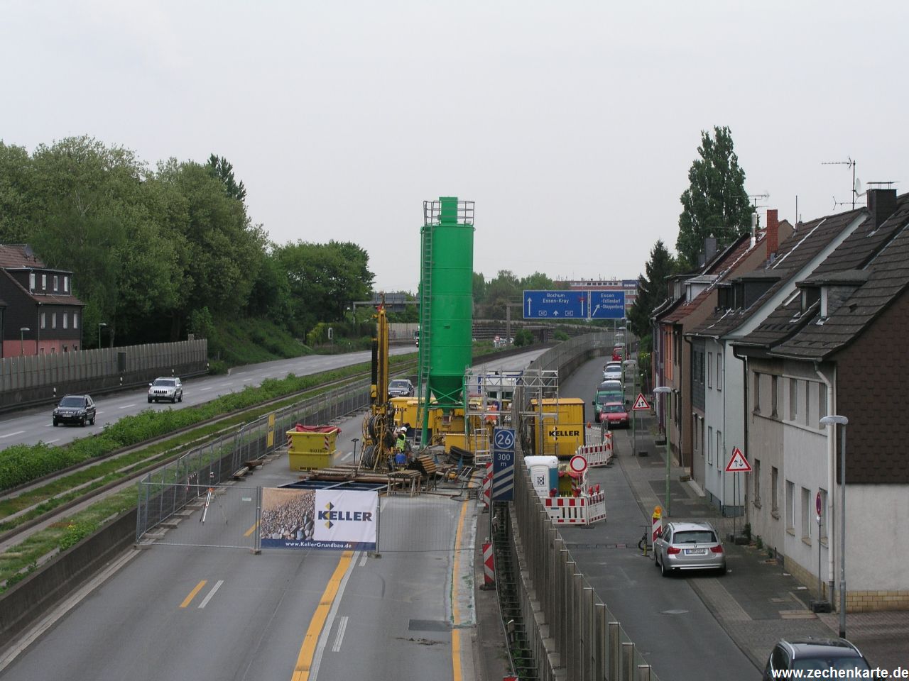 Verfüllarbeiten am Schurfschacht Joachim der Zeche Königin Elisabeth in Essen auf der A40 im April 2014. Eigenes Bild.