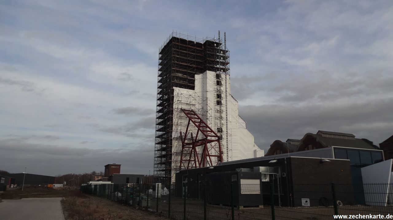 Fördergerüst von Fürst Leopold Schacht 2 in Dorsten in 2020 während Renovierungsarbeiten. Eigenes Bild.